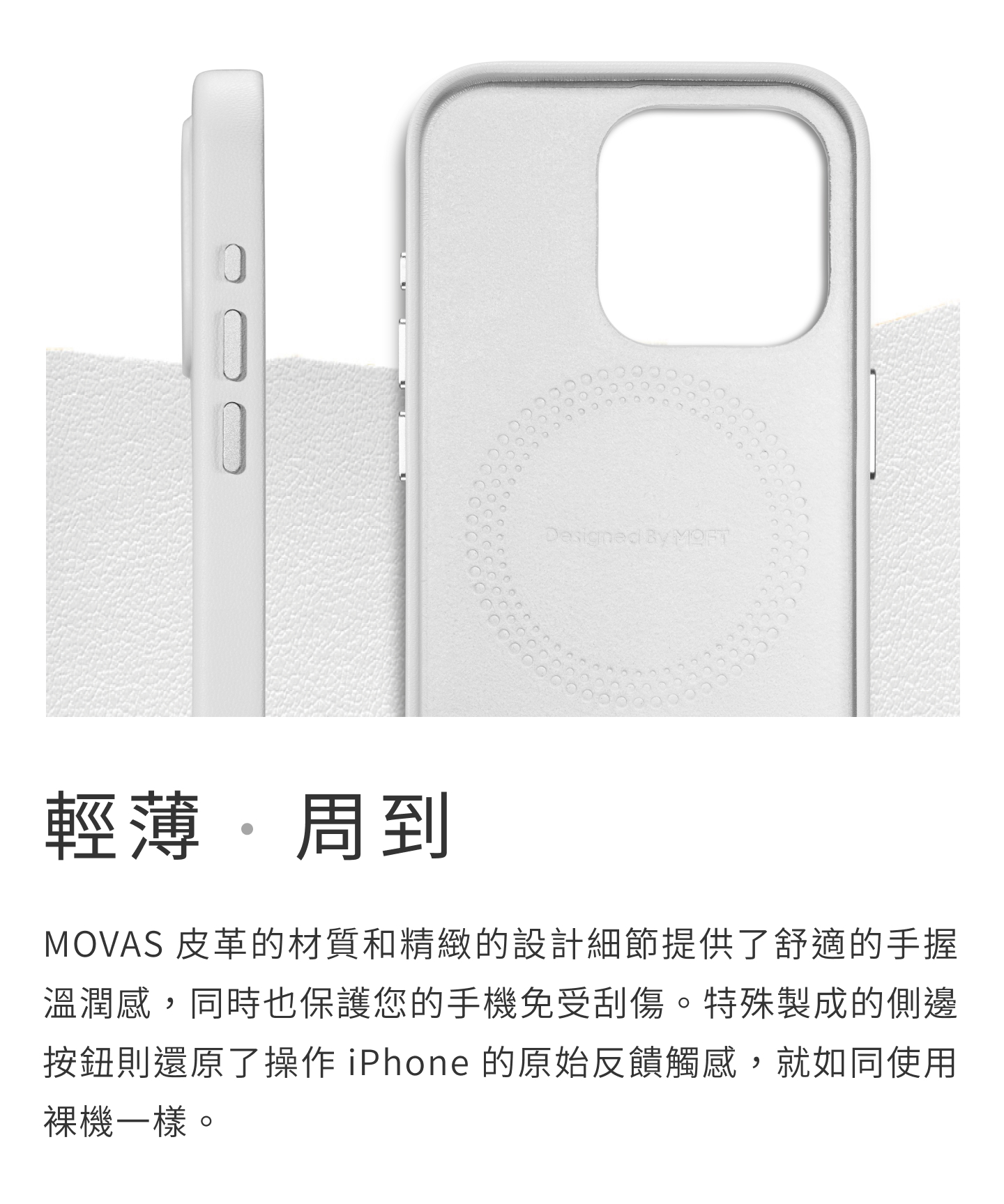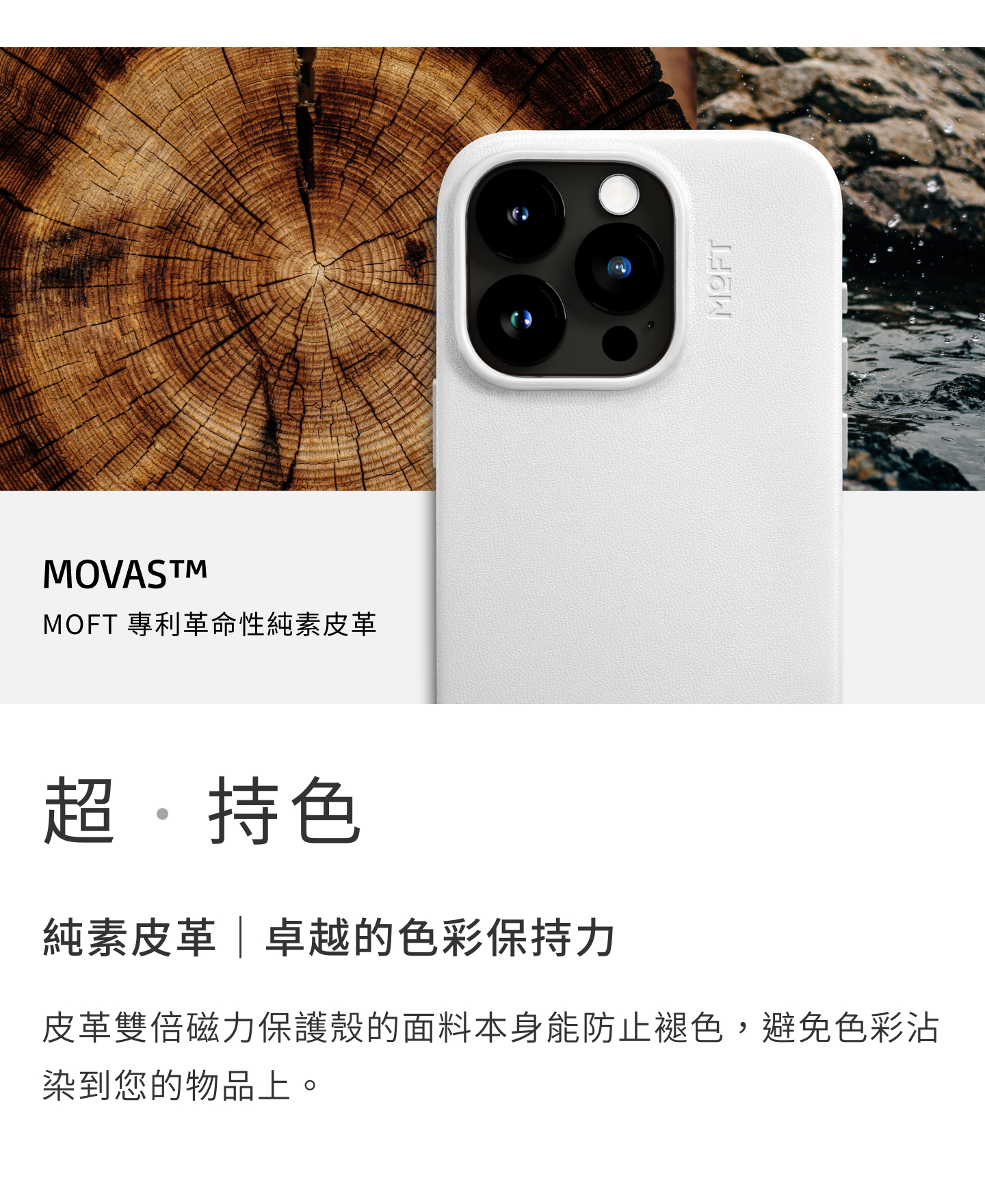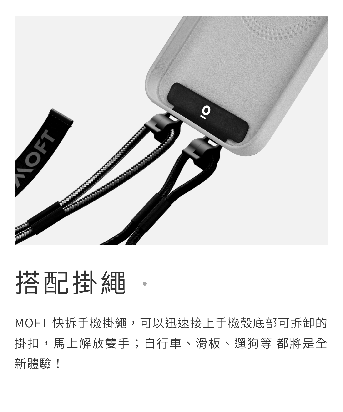 皮革磁力保護殼內部設有插槽,且附贈 2 片掛繩掛扣片,可用於 MOFT 手機快拆掛繩(需另購)。
