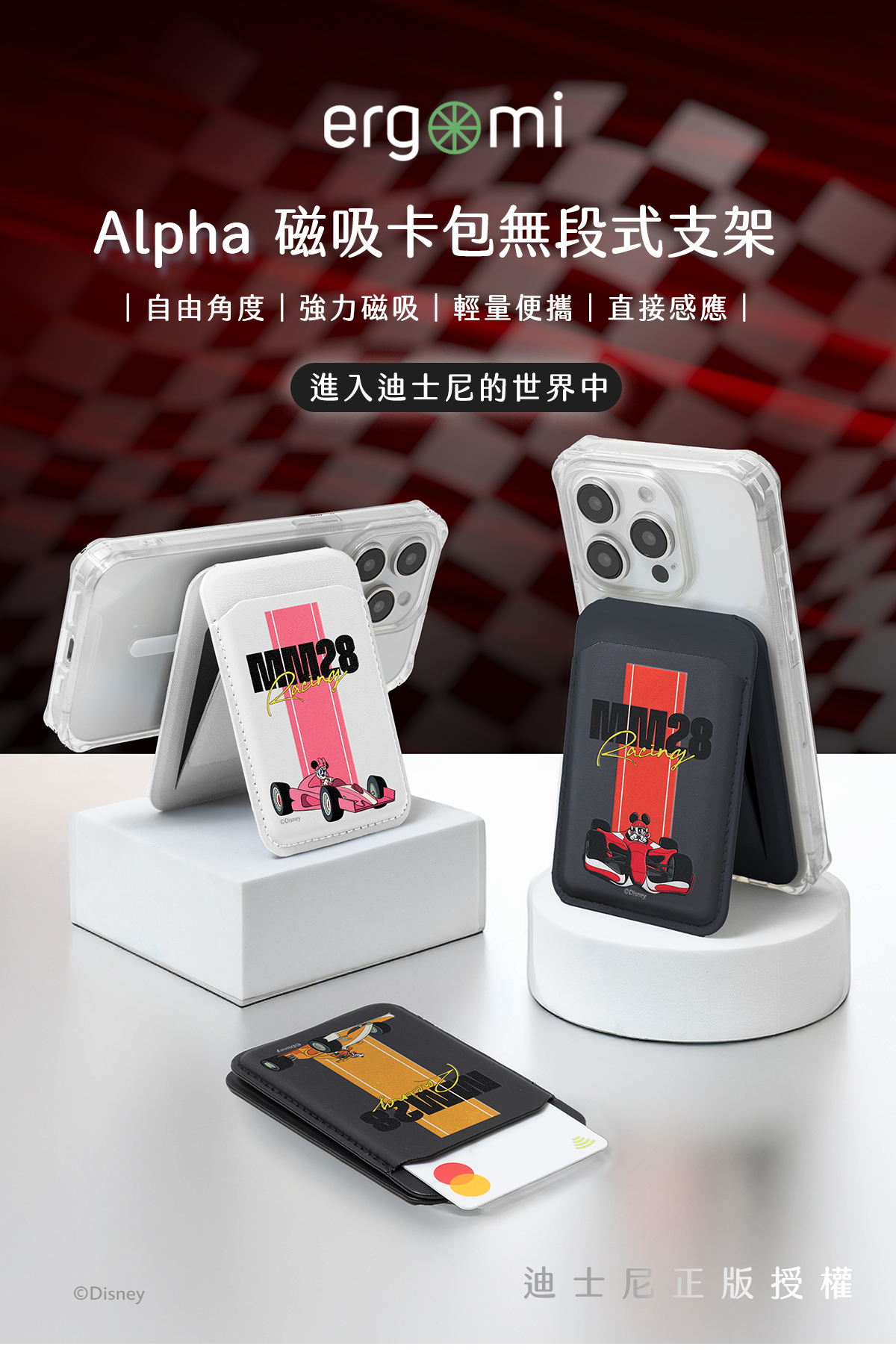 【米奇好朋友】Alpha|輕薄磁吸無段式手機支架_迪士尼xF1賽車_全速米妮 | ergomi