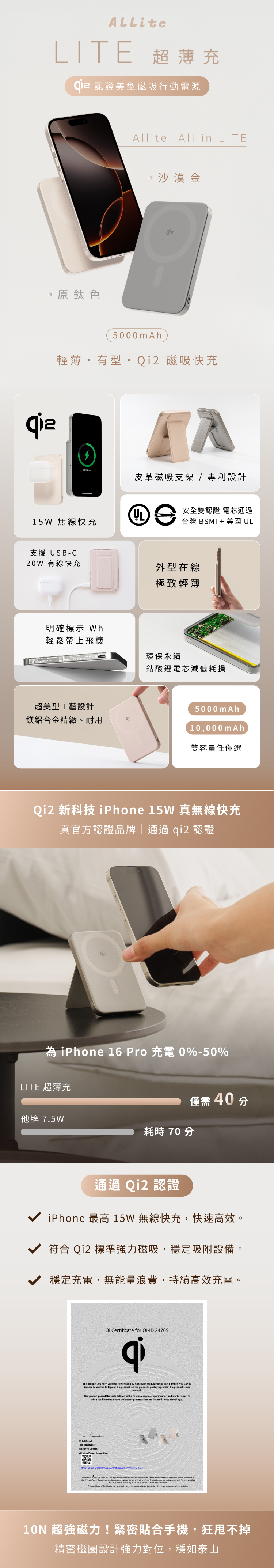 LITE 超薄充 5000 mAh Qi2 磁吸支架行動電源( 產品標示 Wh,可帶上飛機 )| Allite