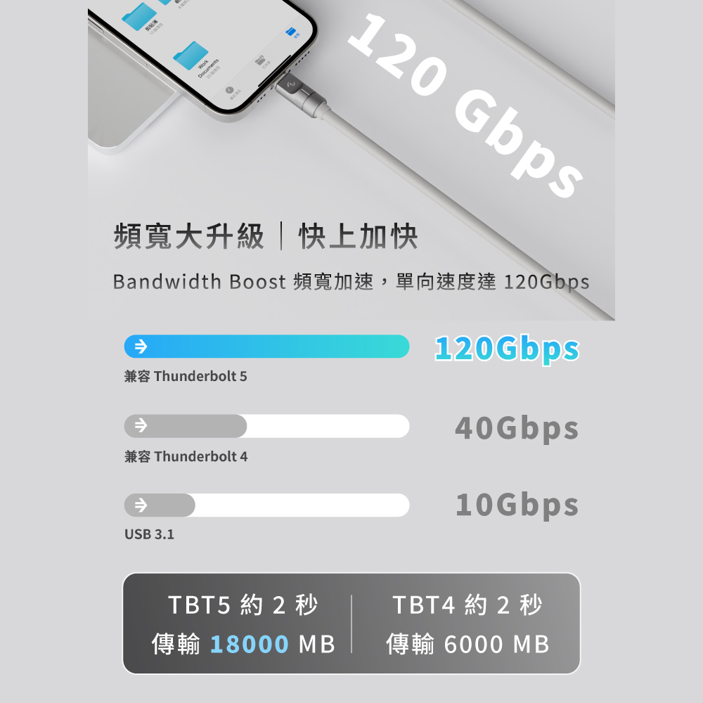 • 傳輸速度高達120Gbps,支援4K/6K/8K顯示、快速資料備份與即時影音傳輸。